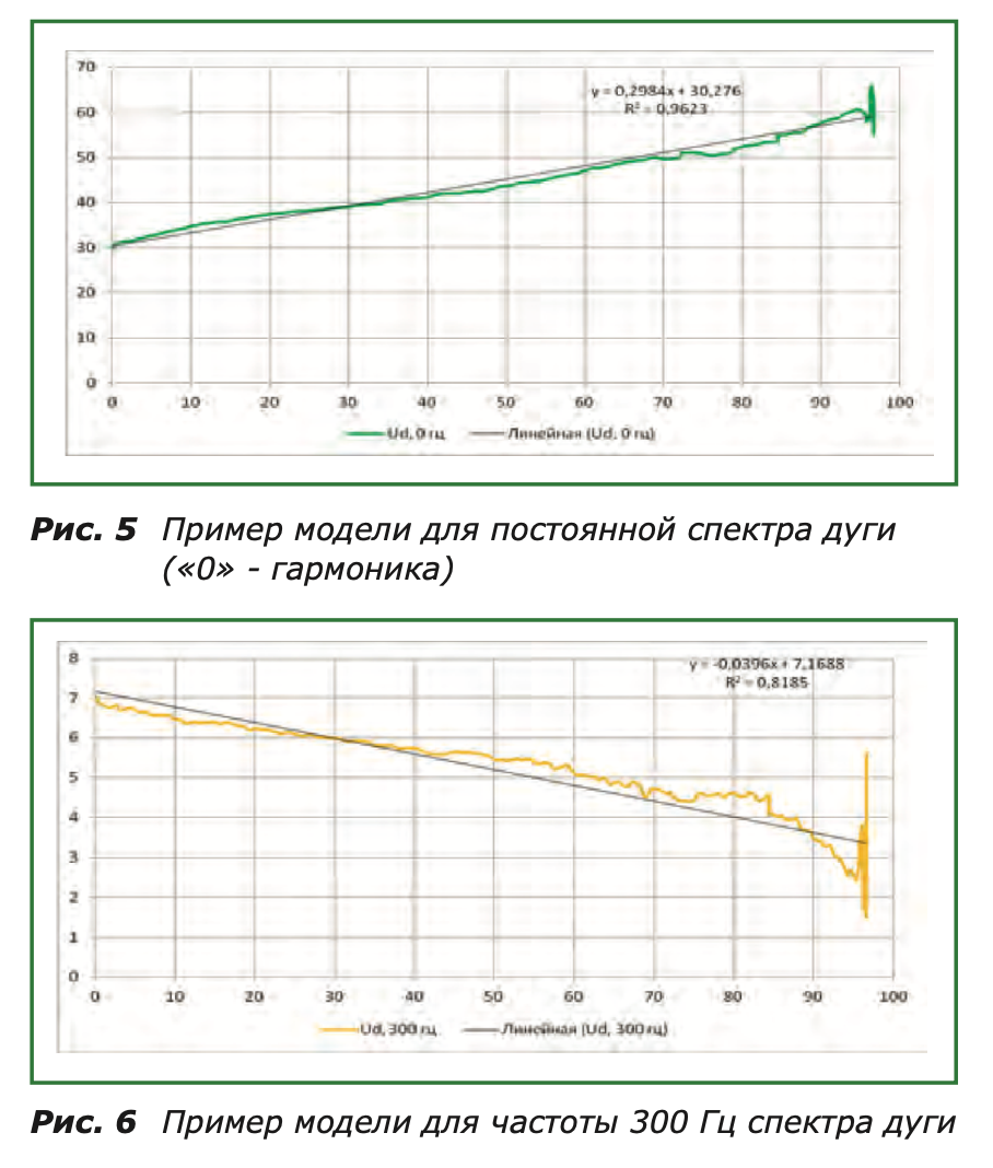 На рисунке 4 приведен пример видеокадра ПО, где показано поведение параметров на промежутке времени в 40 секунд. Как показано на кадре, рост значения межэлектродного промежутка характеризуется поднятием падения напряжения, так называемой «пилы», на уровень 2–8 В. На рисунках 5 и 6 показаны зависимости падения напряжения для модели L0d(t) и L300d(t), соответственно для постоянной составляющей спектра дуги и частоты 300 Гц. Как видно из рисунков, имеется сильная корреляция линейной модели и поведения напряжения на дуге в зависимости от межэлектродного промежутка. После обработки данных провели их запись на жесткий диск компьютера.