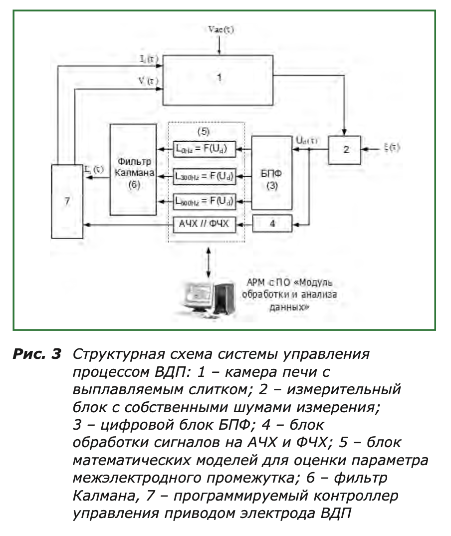 На рисунке 3 показана предложенная структурная схема процесса управления ВДП. Управляющими параметрами служат ток дуги Id(t) и скорость опускания расходуемого электрода Vx(t). Остаточное давление V ac(t) в процессе плавления поддерживают постоянным на уровне 1–10 мкм.рт.ст. Измеренное падение напряжение между электродом и слитком поступает в блок 3 и блок 4. В блоке 3 проводится цифровая обработка сигнала Ud(t). Спектральный анализ сигнала проведен на основе БПФ.