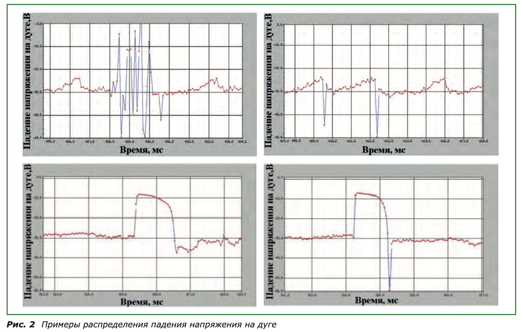 На основании этих данных можно сделать вывод, что при высокоскоростной обработке и записи параметра напряжения дуги можно идентифицировать такие «всплески» напряжения, по которым можно выявить появление нежелательных газов. Идентификация объемных ионизаций и переходных процессов дуги во время горения в парах инертного газа позволит по-новому взглянуть на процесс управления плавкой и осуществления контроля качества слитка.
