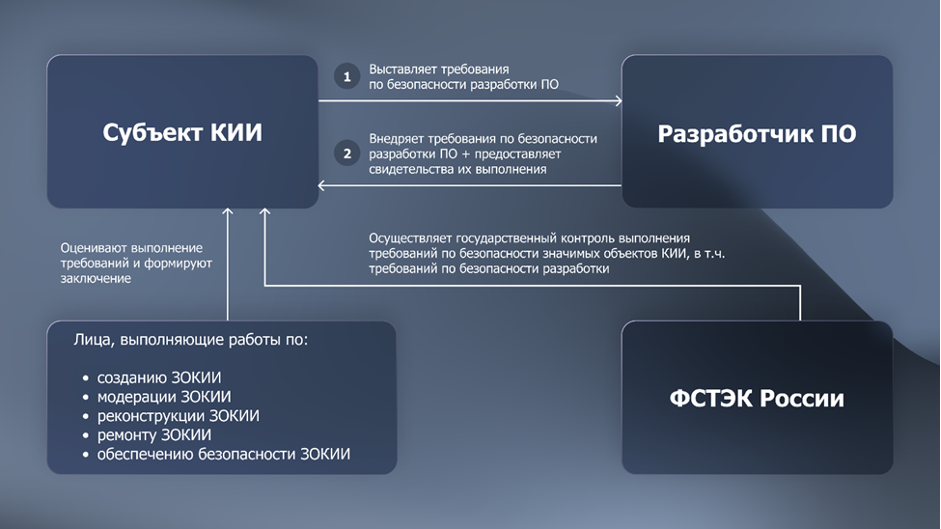 Где в этой схеме разработка ПО? Это же не субъект и не объект КИИ. Дело в том, что результатом разработки пользуются в компаниях-субъектах критических информационных инфраструктур. Они же предъявляют требования безопасности, которым должен соответствовать итоговый результат.