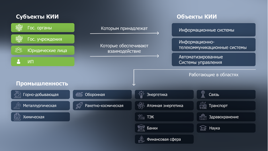 Критическая информационная инфраструктура (КИИ) — система, включающая объекты критической инфраструктуры и сети электросвязи, необходимые для их функционирования и взаимодействия. Под объектами КИИ подразумеваются информационные системы, системы управления и информационно-коммуникационные сети. Субъекты — госорганы, госучреждения, юридические лица, ИП, управляющие или владеющие такими информационными сетями или их компонентами, организующие их взаимодействие.
