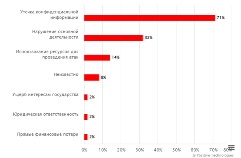 Один из графиков, показывающих последствия атак на IT-компании и их соотношение в 2023 году. Источник — отчет Positive Technologies.