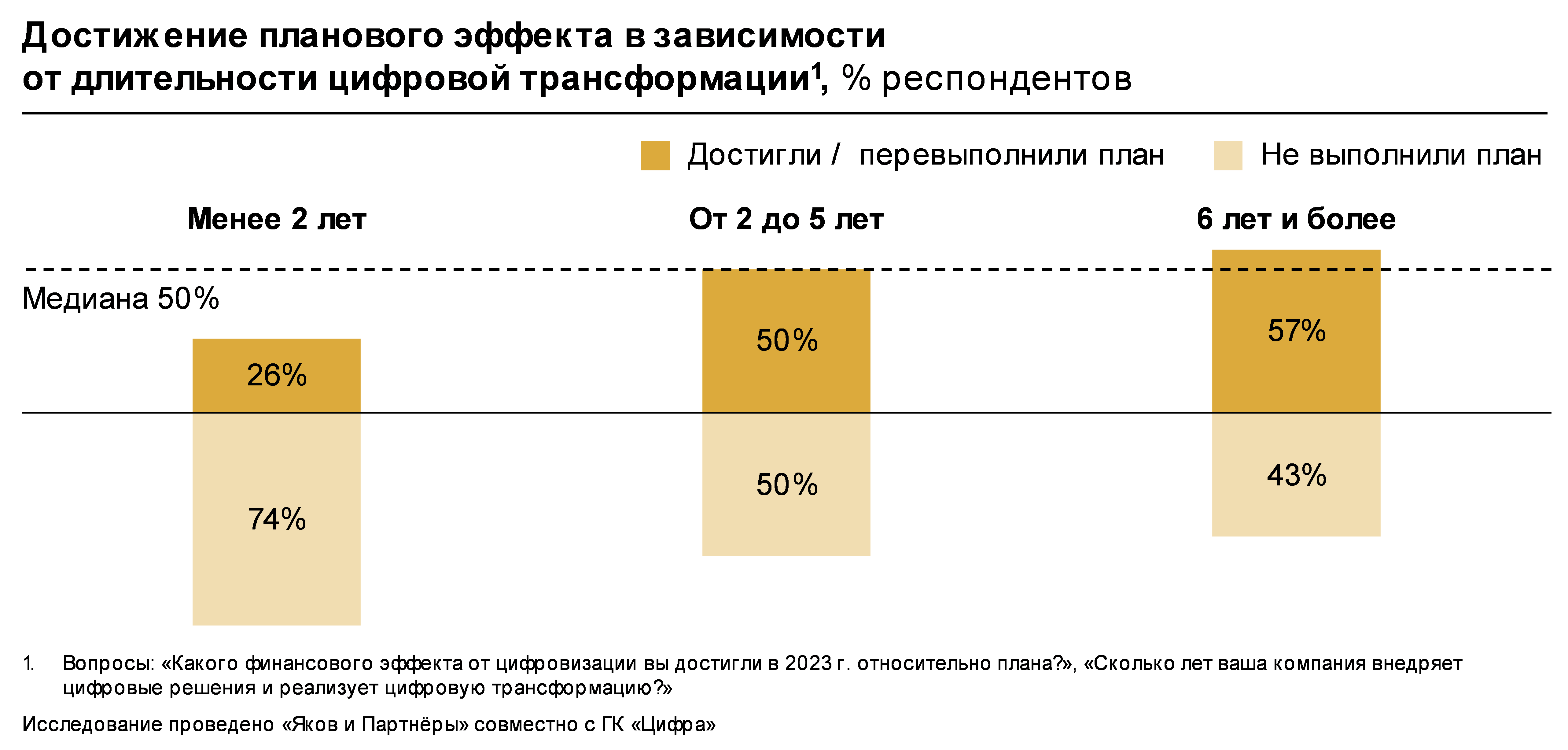 В среднем каждый второй опрошенный достигает плановых целей цифровизации, при этом авторы исследования отмечают двукратную разницу в успешности ИТ-проектов опытных цифровизаторов и новичков.