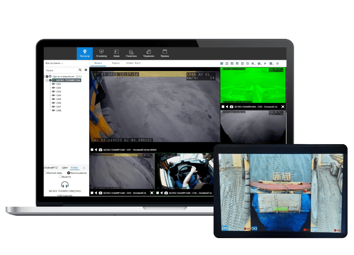 Система исключает слепые зоны и позволяет контролировать всё пространство вокруг горной техникиЗапись архива и журнала тревог